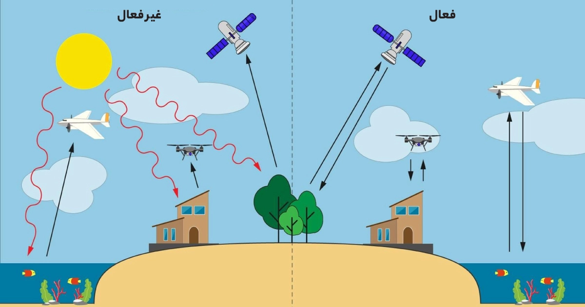 - فعال و غیرفعال: حسگرهای غیرفعال، انرژی بازتاب شده از خورشید را دریافت میکنند درحالیکه حسگرهای فعال، خودشان انرژی را ارسال کرده و بازتاب آن را ثبت میکنند.